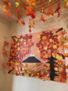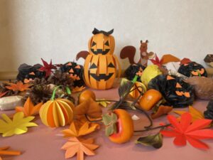 2階スタッフ作の季節のフロア飾りは、みんなで作っているとのことですが