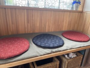 玄関に置いている丸い座布団(と深緑色のカバー)