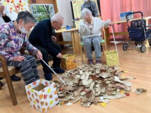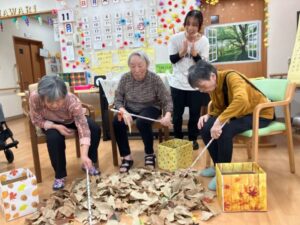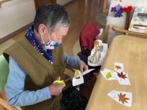 落ち葉作りや栗を画用紙で切ったり貼ったり準備も入居者様と楽しんで行い