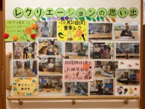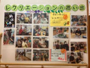 レクリエーションの思い出の写真を廊下やエレベーターホールに飾っています
