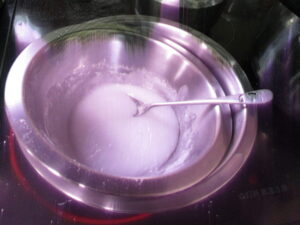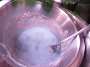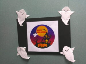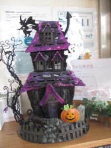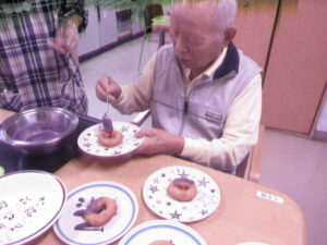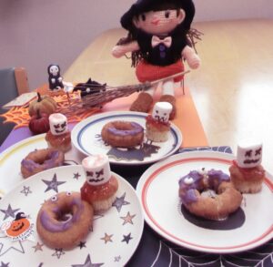 アイシングをドーナッツにかけて目玉に見立てたお菓子をのせます。