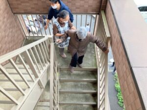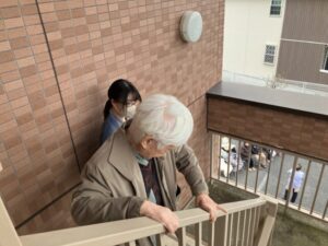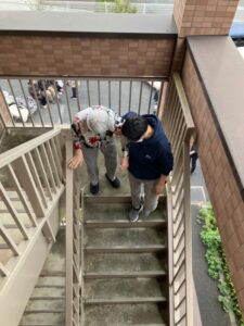 普段使わない外階段を下りて避難します。