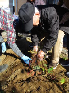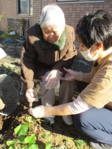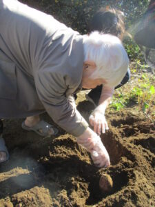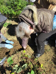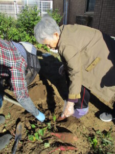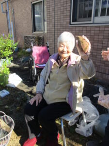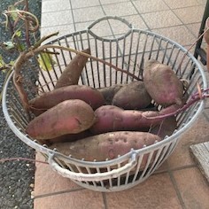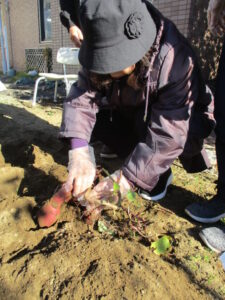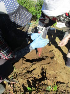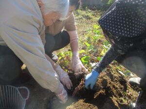 芋ほりのできない方には畑の側で採れたてのお芋を見て頂きました。