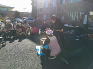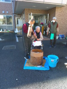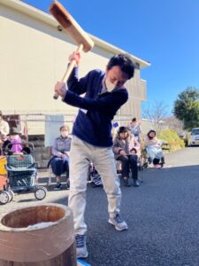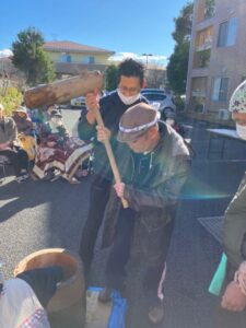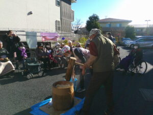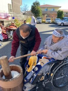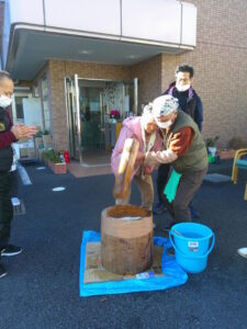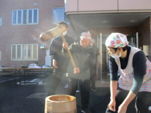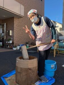 ホーム長も自慢の?怪力で餅つき。