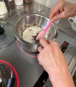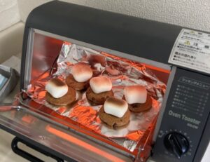 チョコチップクッキーにマシュマロをON、フォンデュ用に溶かします。