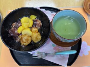 熱いので冷まし冷まし みたらし(スタッフ手作り)とあんこで味付け(栗🌰をそえて)