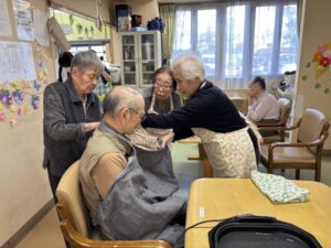 👇エプロンを脱ごうとしたら、あら👀3人も集まりお手伝いしています(優しいです😊)