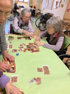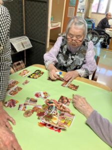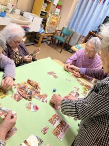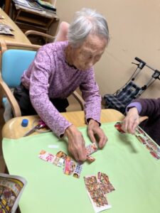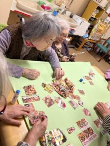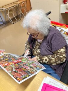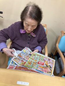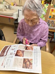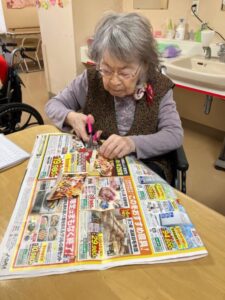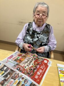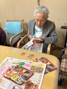 食欲の秋も相まって女性入居者様が集まり美味しそうなお弁当などの広告を切っています✂