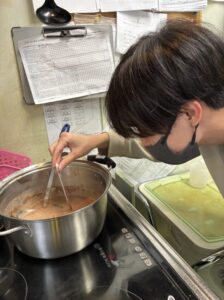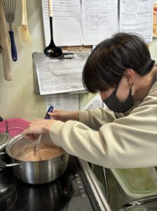 慣れない手つきでチョコを溶かしていきます✌