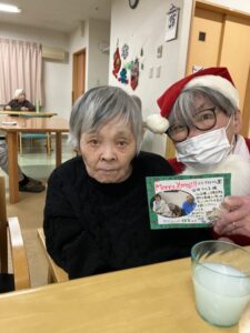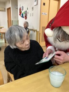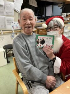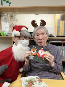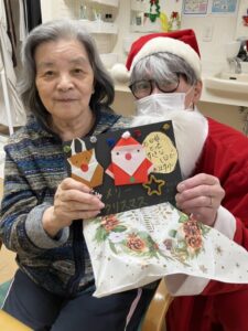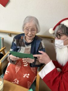 黒縁眼鏡のホーム長サンタがみなさまにプレゼントとメッセージカードを