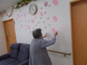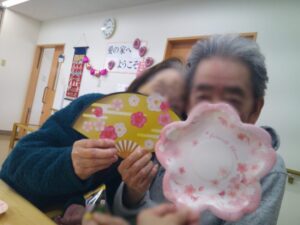 春を感じていただけるよう天気の良い日には、職員と一緒に外へ出て日光浴や散歩を楽しんでいただきました。「外の空気は気持ちがいいね」「暖かくなってきたね」と、自然と笑顔がこぼれるご様子が印象的でした。また、施設内でも春らしさを感じていただけるよう、ひな祭り行事や壁面には桜花をモチーフにした飾り付けを行いました。入居者様と一緒に制作した作品もあり、「きれいだね」「春が来たね」といった声が聞かれ、和やかな時間が流れていました。
