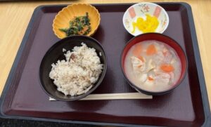 きのこご飯・豚汁・ほうれん草の胡麻和え・お漬物