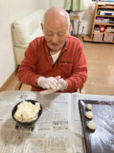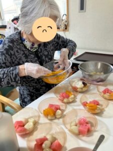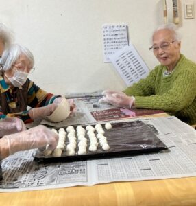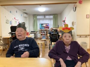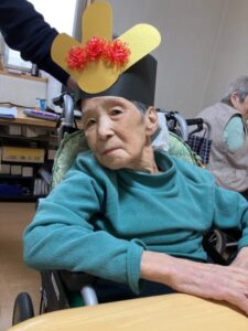おやつ作りの合間にスタッフが作ったお雛様かんむりを被り