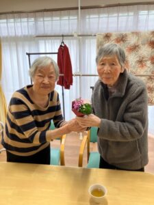 ユニットを代表した入居者様よりお花を贈呈して頂き、その後は特別なティータイム。