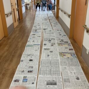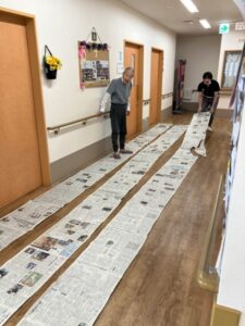 廊下半分の新聞紙が並び、一体?