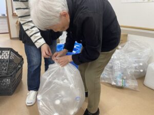 大量の空のペットボトルを片付けていると、