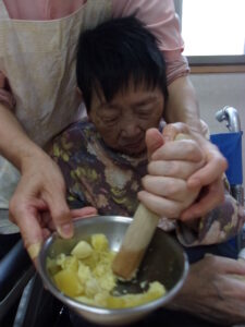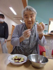 柔らかくなったさつま芋の皮を皆さんが協力して剝いてくださいました。