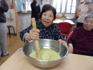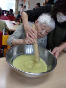 ペースト状になるまで腕が疲れるので皆さんに少しずつ順番に潰して頂きました。