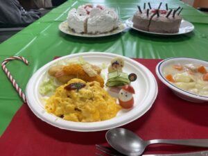 食事とケーキの間にはゲームやクリスマスソングの合唱で盛り上がり、