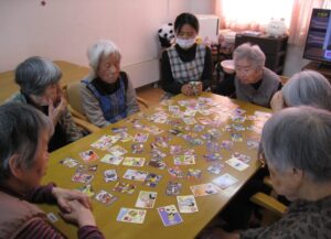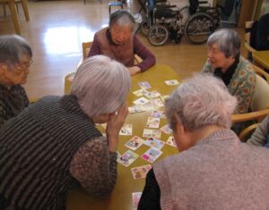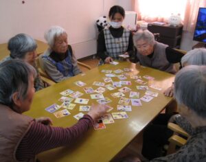 テーブルいっぱいに広げられたカルタ取りのスタートです。📣