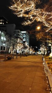 いちょうの並木道が綺麗な光の装飾に包まれていました。