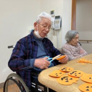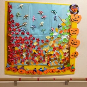 愛の家グループホーム大垣では、季節の移ろいを感じていただけるよう、ハロウィンと秋をテーマにした掲示物を、ご利用者様とスタッフが一緒に作成しました。