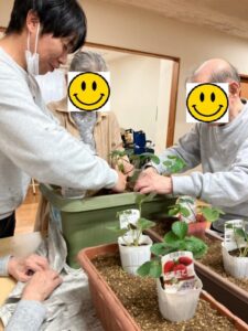 今日は、ホーム内でご利用者の皆さまと一緒に、イチゴの苗をプランターに植えました。