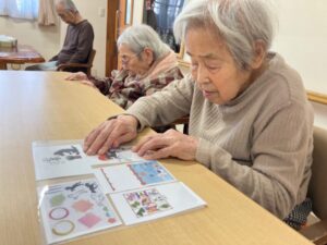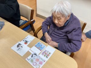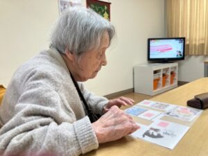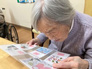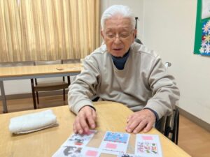 絵を見ながら「こんな小さいの見えん」と言いながら絵を持ち上げ目の前に持って