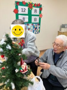 女性の利用者様は飾りを見ながら「可愛いね」と