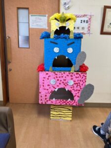 今年の節分行事では、みなさんに楽しんでいただけるよう、段ボールで大きな鬼の顔を手作りしました!なんと3段になった迫力満点の鬼のお面です👹✨