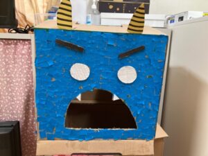 今年の節分行事では、みなさんに楽しんでいただけるよう、段ボールで大きな鬼の顔を手作りしました!なんと3段になった迫力満点の鬼のお面です👹✨