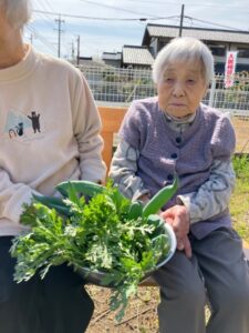暖かな日差しの中、皆さまと一緒に日向ぼっこを楽しみながら、畑の野菜の収穫も行いました。今回はねぎと春菊を収穫しました。