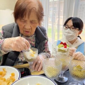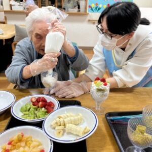 ケーキはF様へ、みんなはフルーツパフェ🍓🥝🍌