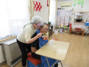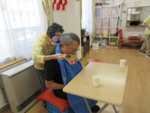 目隠しをして、ホーム長にカップラーメンを食べさせてもらいました
