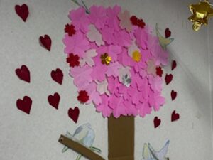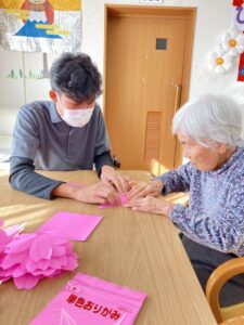 ホームのリビングもピンク色の飾りが増えてきて春らしく