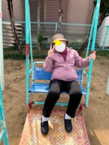 ブランコに乗ってピースをしたり
