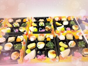 敬老会当日は、お祝い膳として、手毬寿司をメインに彩り豊かなお弁当を提供いたしました。