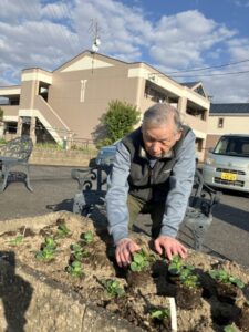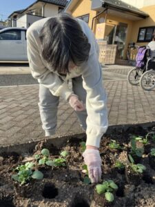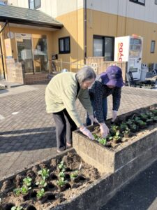 スタッフと一緒にご利用者様たちにもお花の植え替えを手伝っていただきました。