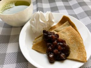 そば粉で作ったクレープ生地に生クリームとあんこを添えてあります🫘