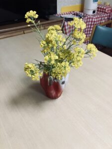 菜の花がきれいに咲いているので一緒に摘みにいき、花瓶に生けてもらいます