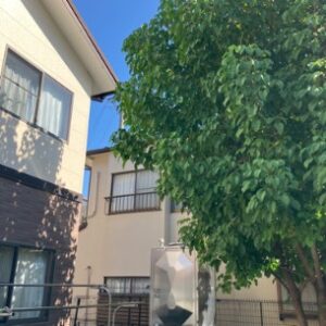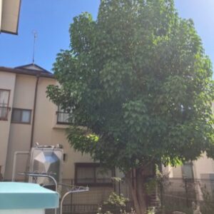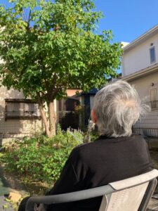 剪定作業が終わりさっぱりした木を中庭にてご覧になるY様。