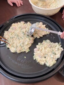 「この位?」「もっと大きくする?」など皆で相談しながら生地を流し入れて頂きました。