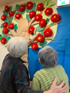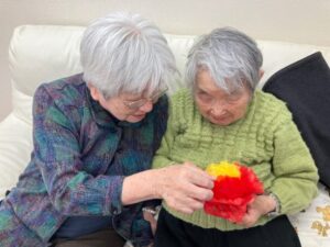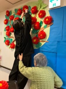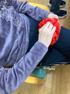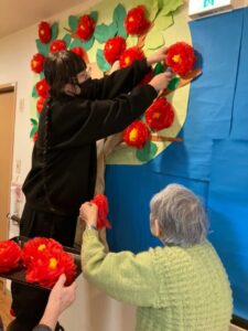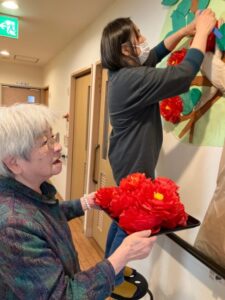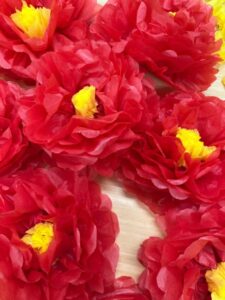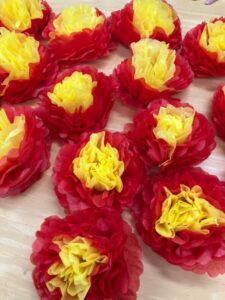 赤と黄色のお花紙を丁寧にひろげていきます🌺