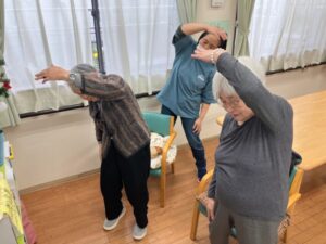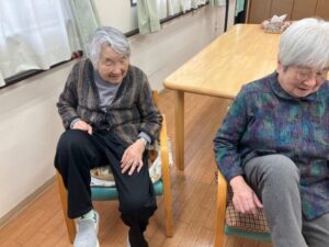 外に出ることが難しい日には室内での足上げ運動を行いました。
