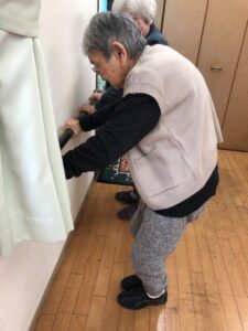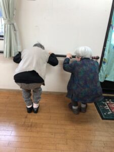 外に出ることが難しい日には室内での足上げ運動を行いました。