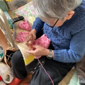 ちなみに本日着ておられる青色のセーターもご自分で編まれたものです。