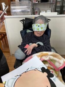 「うまく出来とる?」と目隠しを外すと・・「あははは!変な顔!」とY様。
