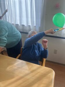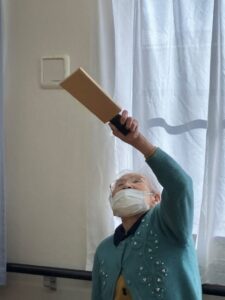 お正月らしい遊びをしようと、羽根の代わりに風船を使っての羽根つき(風船つき)をしました。