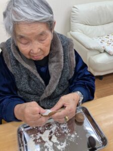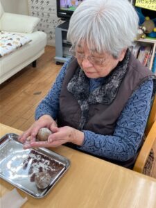 黒糖を練り込んだ生地を丸めていきます。