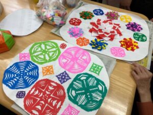 先生が用意してきて下さった綺麗な折り紙を台紙に好きなように貼っていきます。